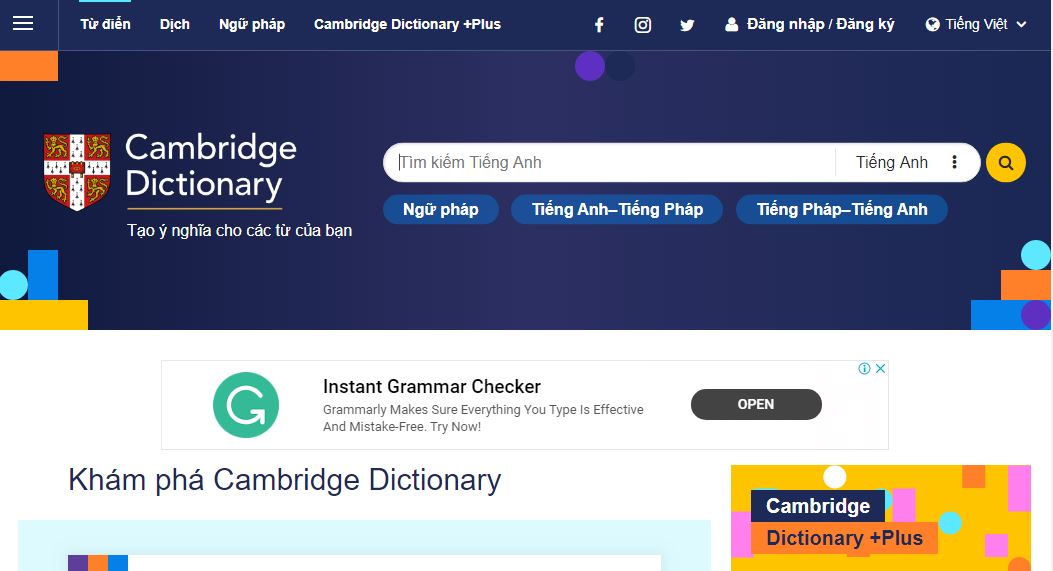 + Cambridge Dictionary là trang từ điển online có lượng từ vựng phong phú nhất lên đến hơn 200.000 từ. Cambridge ghi điểm với người dùng ở việc giải thích nghĩa hay và dễ hiểu với rất nhiều ví dụ được đưa ra để giải nghĩa cho từ.